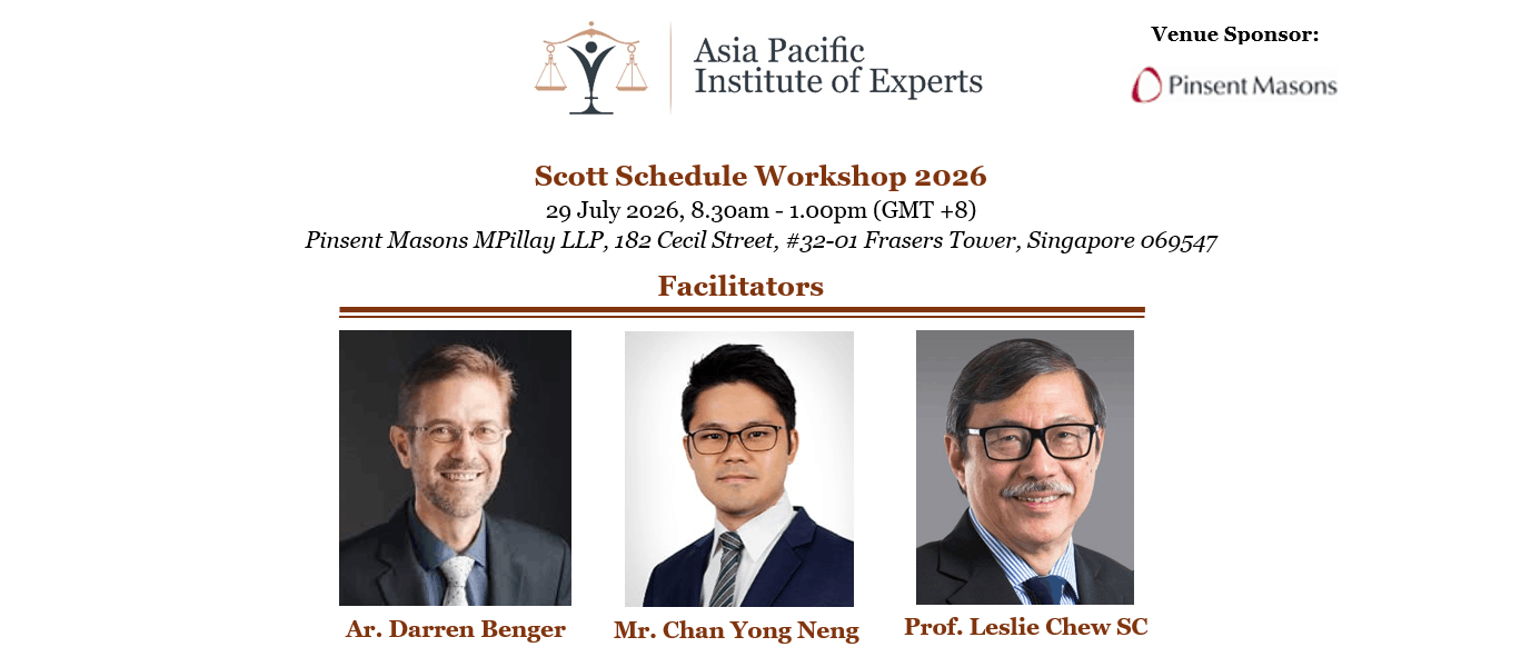 Technical and expert-witness perspectives will be provided by Ar. Darren Benger. Accredited Construction Law specialist, Lawyer Chan Yong Neng, share perspectives from counsel. Former State Courts Judge, Professor Leslie Chew SC will provide review and feedback from a judge's perspective.